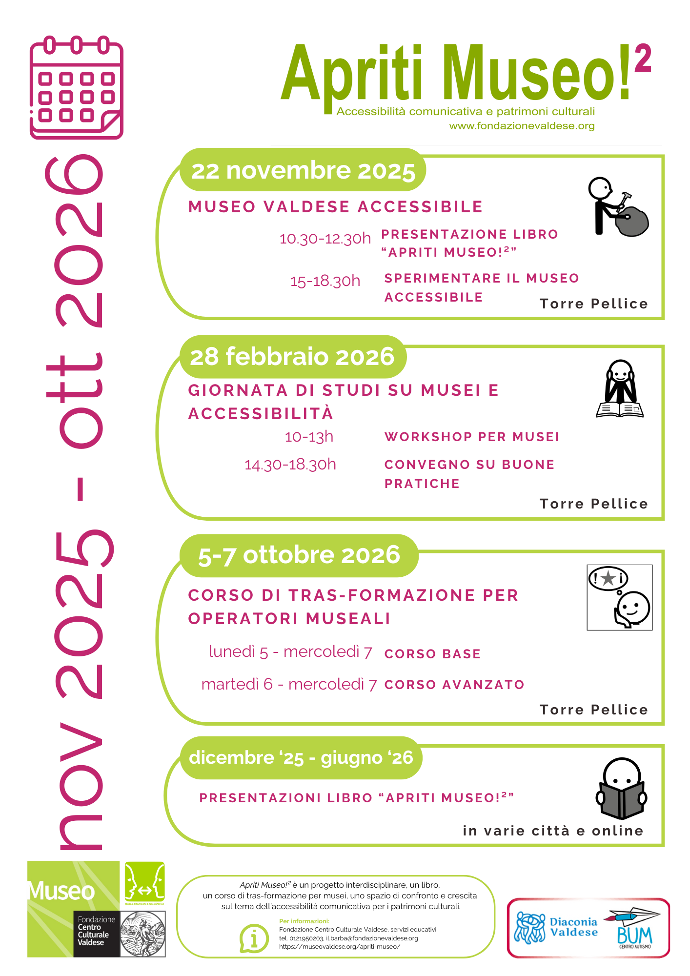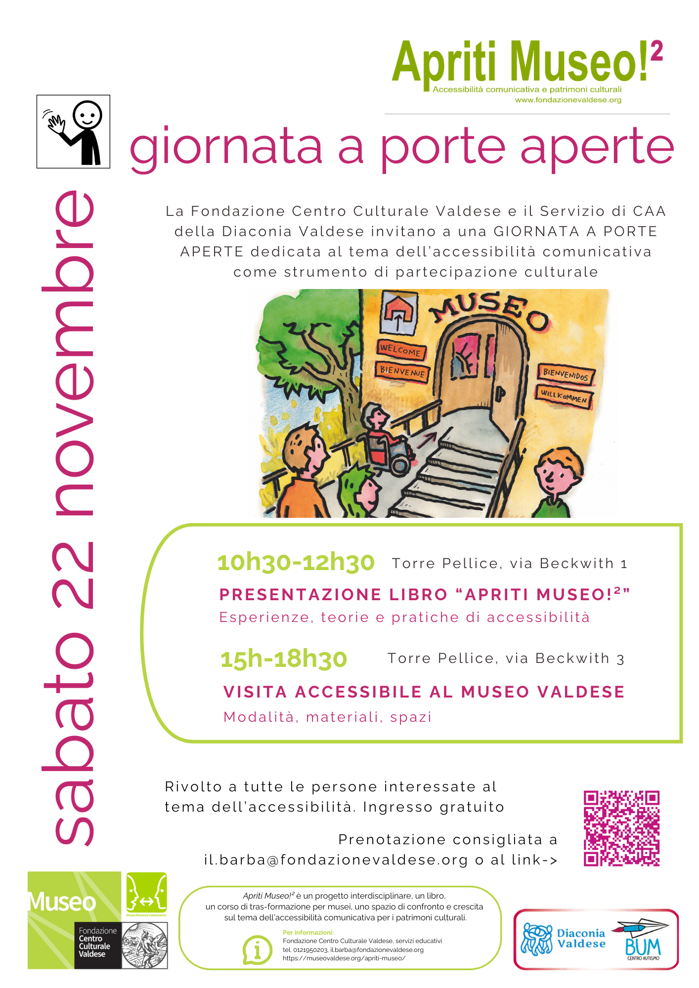 Sabato 22 novembre 2025, a Torre Pellice, ritorna Apriti Museo!² con una giornata a porte aperte sul tema dell’accessibilità comunicativa per i patrimoni culturali. Dalle 10.30 alle 12.30 vi sarà una presentazione del libro del 2024 – “Apriti...