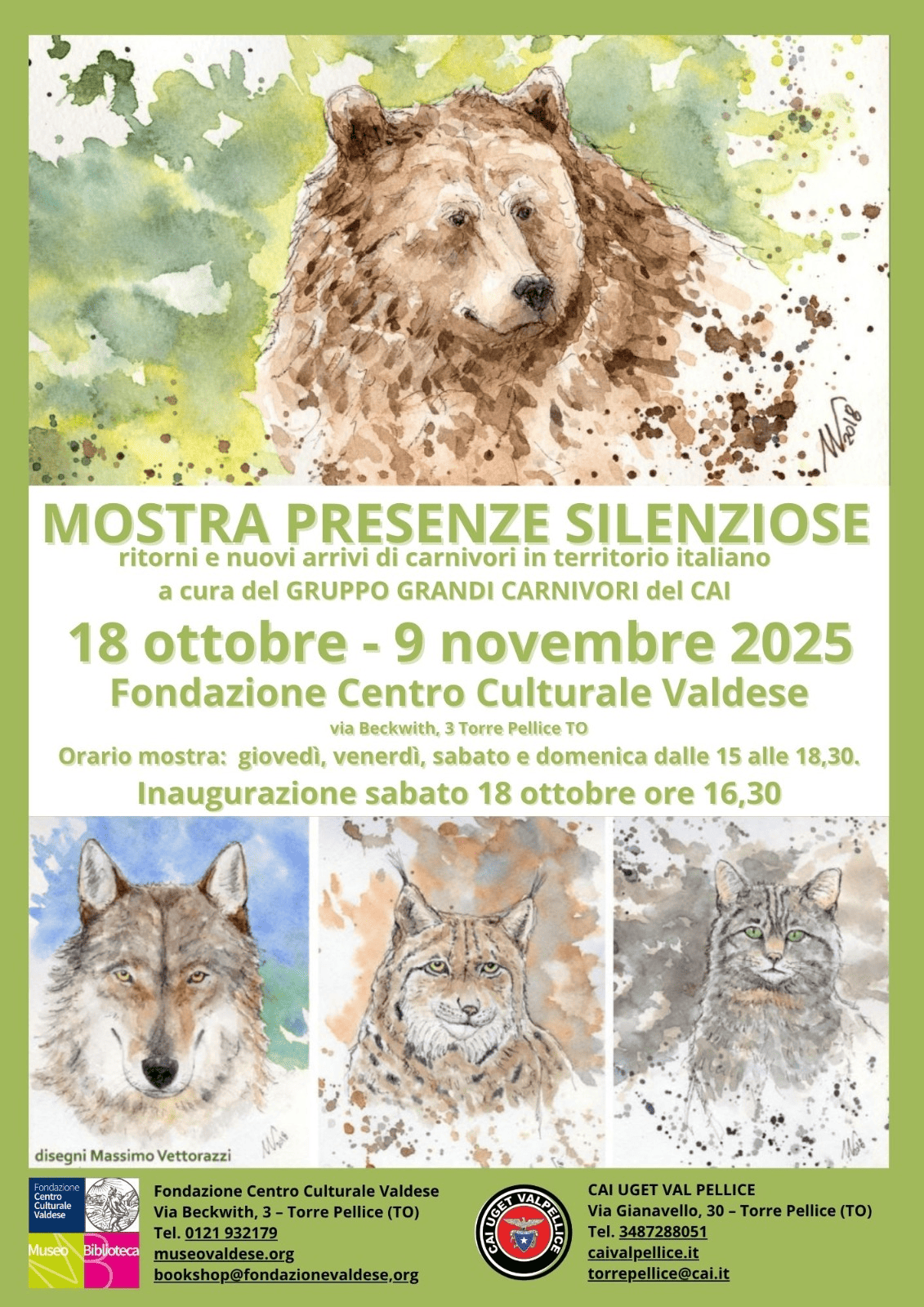 Inaugurazione il 18 ottobre alle ore 16,30 al Museo valdese di Torre Pellice della Mostra PRESENZE SILENZIOSE RITORNI E NUOVI ARRIVI DI CARNIVORI IN TERRITORIO ITALIANO realizzata dal CAI dal Gruppo Grandi Carnivori, che vuole far conoscere meglio il complesso mondo dei predatori selvatici, dei suoi equilibri naturali, ma anche di quelli più delicati insiti nel rapporto con l’uomo e le sue attività. Questo non solo attraverso un elenco di informazioni, ma dando l’occasione al visitatore di ricevere un altro valore aggiunto durante il suo percorso di visita, grazie ai disegni e alle immagini sopracitati.